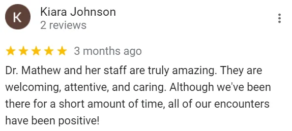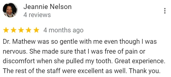 Dr. Mathew earned her Bachelor of Dental Surgery from Saveetha Dental College and Hospital in Chennai, India. She completed a general practice residency to gain clinical experience in general dentistry and had the opportunity to treat patients with oral cancer. While in India, she worked as a general dentist, performing extractions, crowns, dentures, and root canals. In 2008, she relocated to the United States and graduated from the New York University (NYU) College of Dentistry in New York City. During her time at NYU, she participated in research studying oral cancer and human papillomavirus (HPV). Dr. Mathew is an active member of the American Dental Association (ADA), the South Carolina Dental Association (SCDA) and Coastal District.